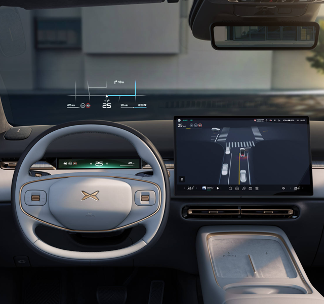 Le cockpit est doté d’un tableau de bord numérique de 8,8″, d’un grand écran central de 15,6″ et de systèmes d’info-divertissement intuitifs. Des matériaux haut de gamme et une isolation phonique renforcée assurent une atmosphère calme et raffinée sur la route.